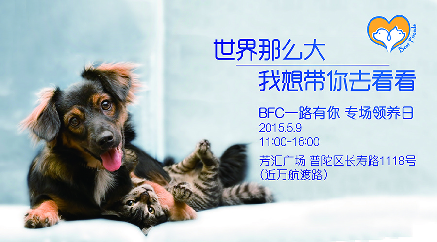 BFC一路有你 专场领养日 BFC Adoption Day@Amanda Plaza Putuo 时间:2015.5.9(周六Sat)11:00-16:30 地点:芳汇广场 普陀区长寿路1118号,近万航渡路(地铁13号线武宁路站) Amanda Plaza Putuo, No.1118 Chang shou Road, crossingWan hang du Road. (Subway line 13 Wuning Road)