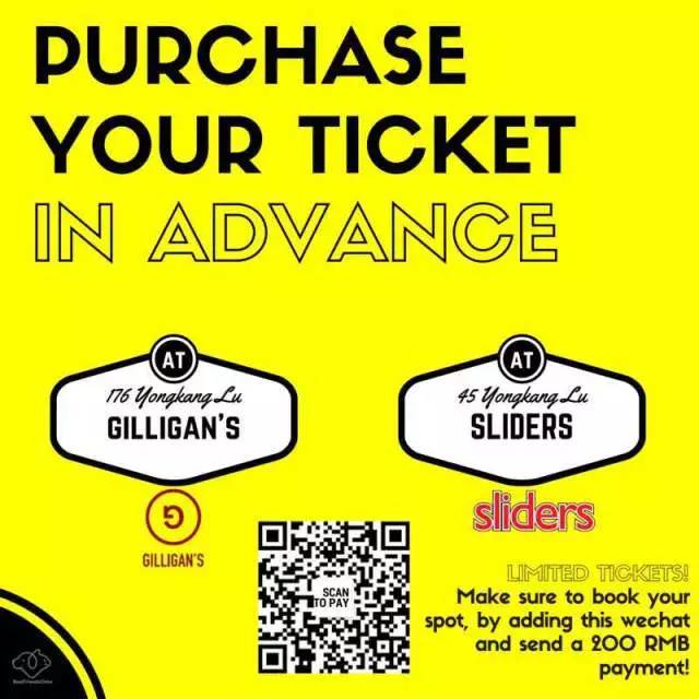 You can purchase your ticket at both Gilligans & Sliders (Yongkang Lu/Xiangyang Lu)