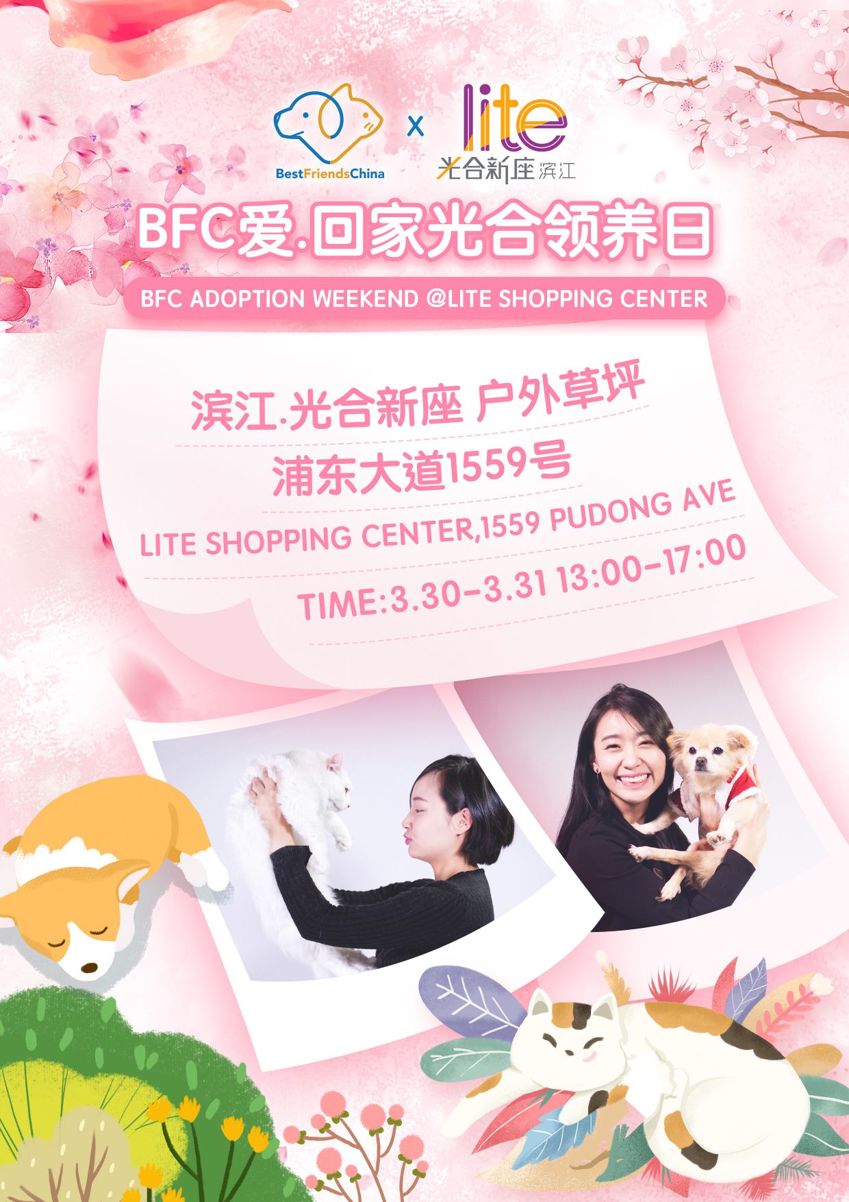 t's getting warm,, do come out and have fun with many cats and dogs in Pudong Lite Shopping Center. BFC 爱·回家 领养日 @光合新座 Lite Shopping Center Date:3.30-3.31 Time:13:00-17:00 浦东大道1559号 Pudong Avve 1559 滨江·光合新座 户外草坪 Outdoor grassy courtyard. (停车免费)