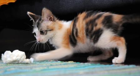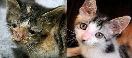 Kitten was found at the Hankou football stadium during a football game. Because of strong eyes infection her eyelid were glued together. She was running completely blind between "crazy" football fans. In the end somebody kicked her into a climbing gym where I was training. She had no chance to survive by herself so, I took her with me back home and to the vet. She had strong eyes and ears infection, broken tail and all kind of parasites.
